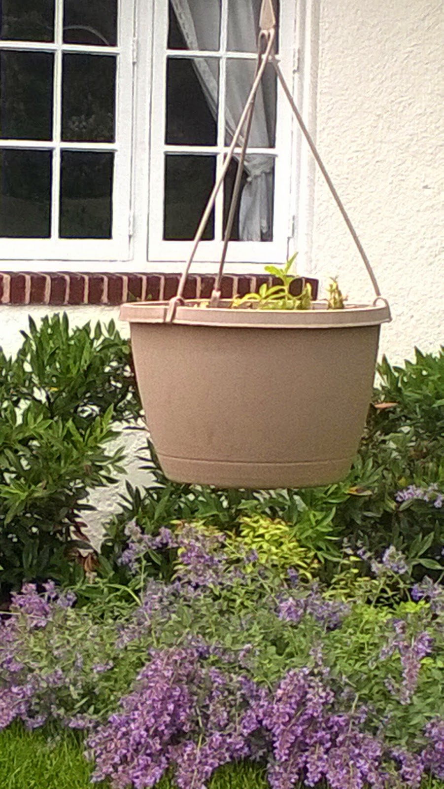 Lucas and I learned this year that, on the color wheel, the opposite of green is red. I have therefore reached the conclusion that when it comes to gardening, I have a red thumb. The bean plants in my vegetable garden are half the size of those in my neighbor’s yard -- and I had the advantage of starting them in a greenhouse. See also Exhibit B, below. This was the beautiful hanging basket that Eric bought for Mother’s Day. Give me a week with a plant, and this is what happens.